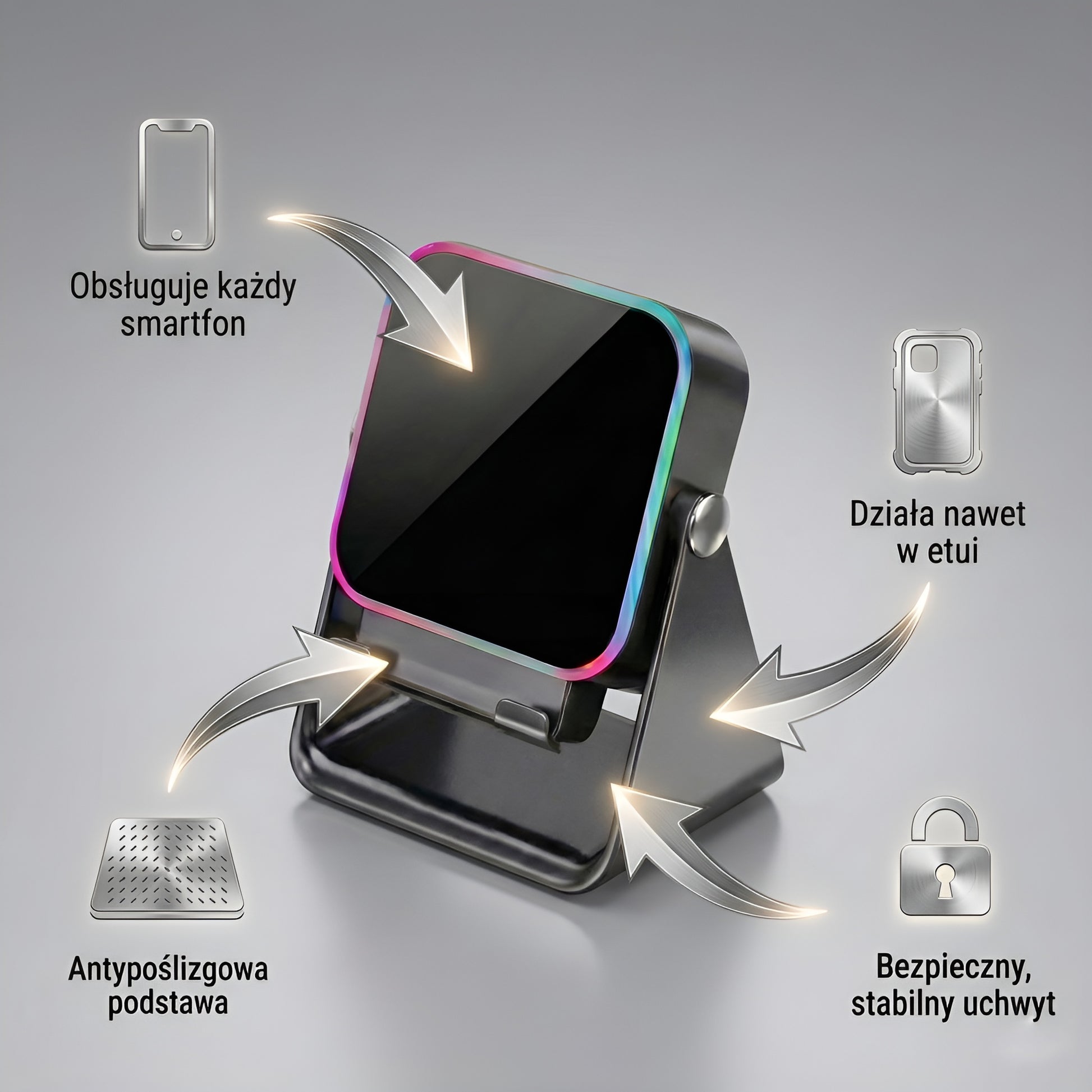 Dźwięk zostaje natychmiast wzmocniony, a bateria zaczyna się ładować bezprzewodowo. Ty oglądasz w pełnym komforcie, a telefon stoi stabilnie pod idealnym kątem.